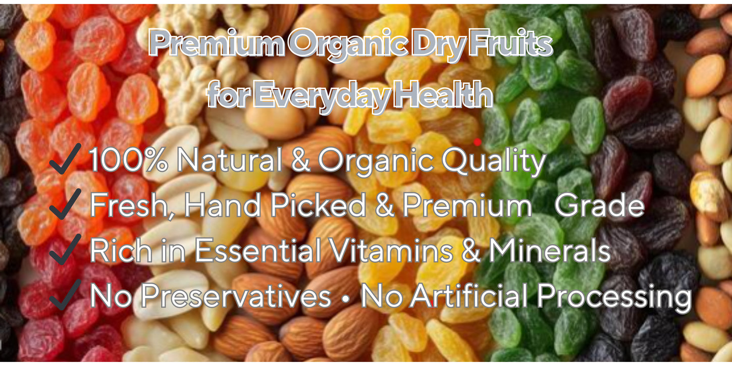 Our organic dry fruits are hand-selected from trusted farms and processed to maintain maximum freshness, nutritional value, and natural flavor. From crunchy almonds and brain-boosting walnuts to naturally sweet dates and creamy cashews, our dry fruits are packed with vitamins, minerals, antioxidants, and healthy fats making them the perfect addition to your daily diet, fitness routine, or family nutrition plan.